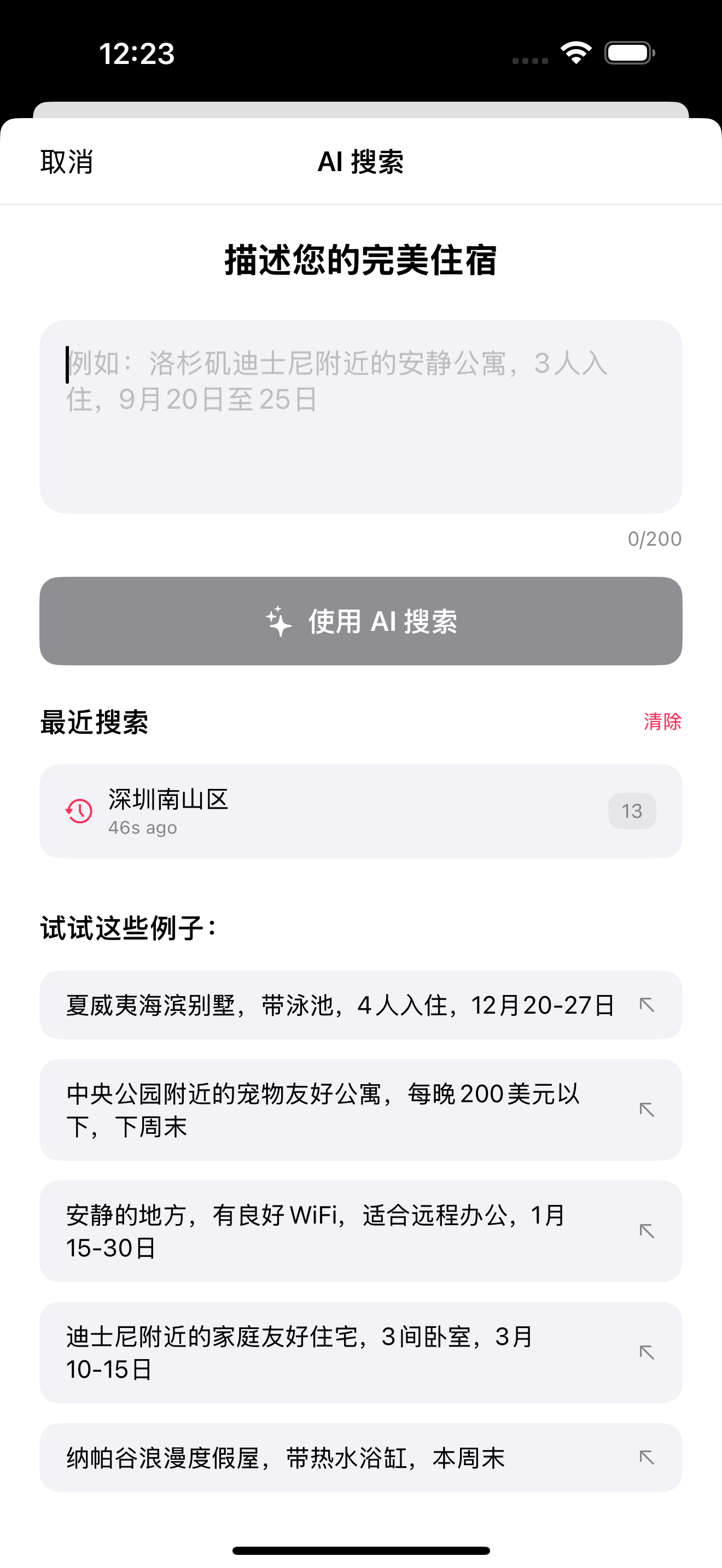 使用方法: 1. 点击AI搜索按钮(闪光图标) 2. 描述您的需求(如”世界之窗附近安静的公寓,2人,下周末,500元以内”) 3. 查看解析结果,点击”搜索”或”修改”