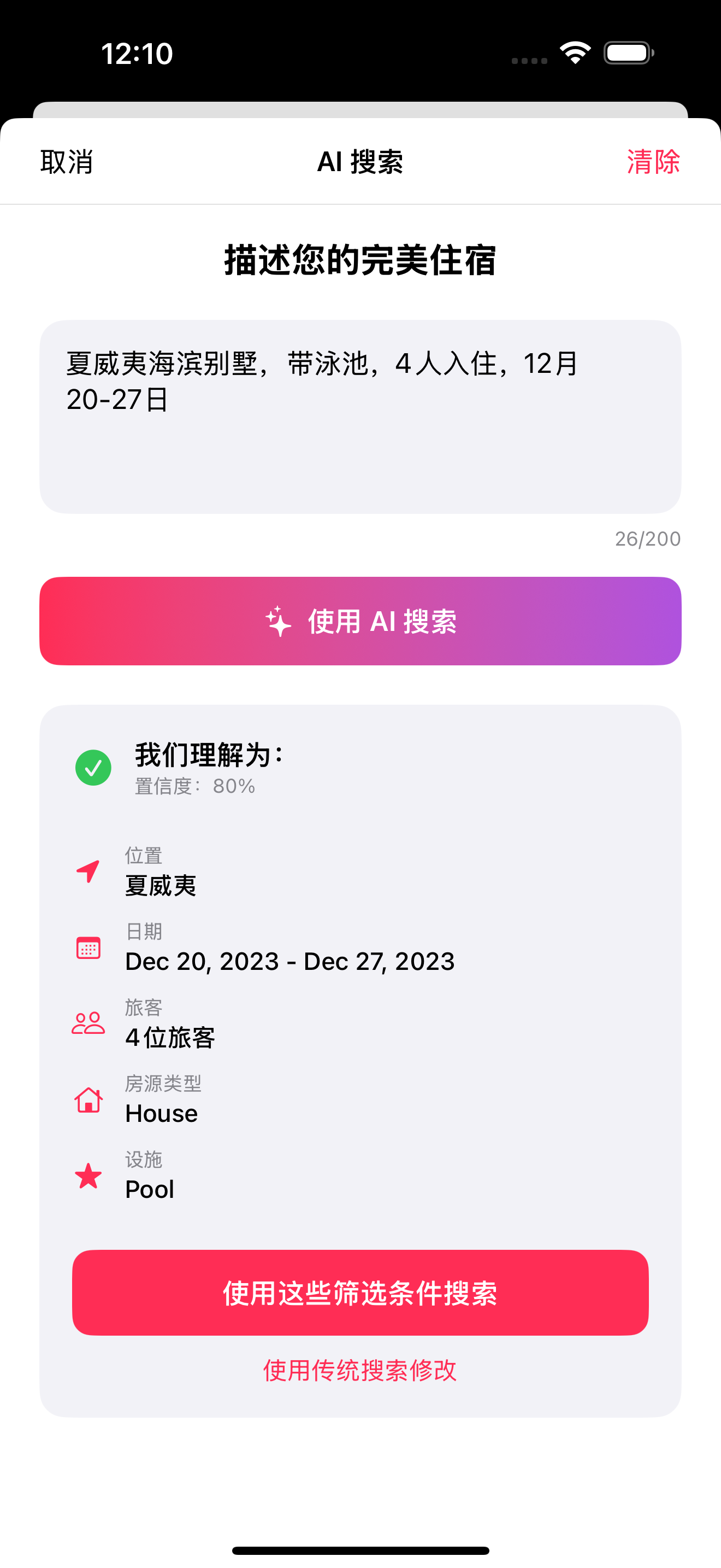 用自然语言描述理想住宿,AI会自动解析并应用筛选。