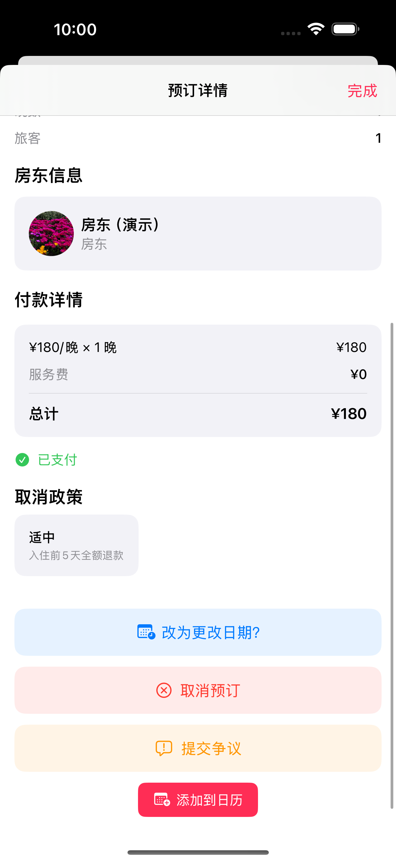 操作: 联系房东、取消预订、报告问题、发表评价(入住后)