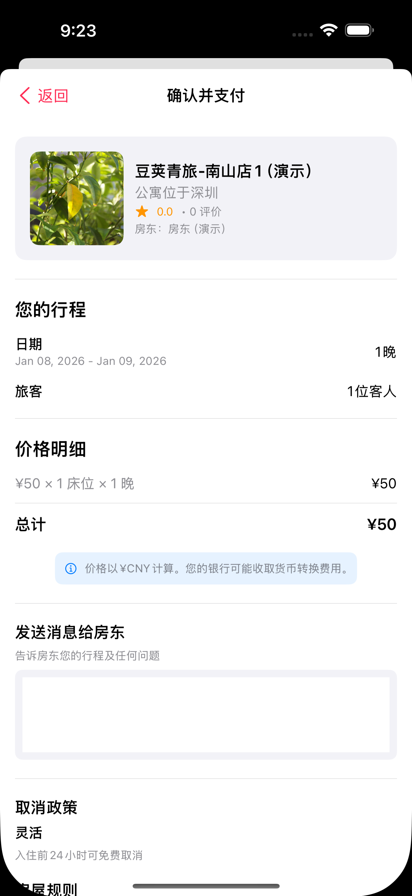 取消政策: | 政策 | 全额退款期限 | 部分退款 | 服务费 | |——|————-|———|——–| | 灵活 | >24小时 | 50%(<24小时)| 可退 | | 中等 | >5天 | 50%(2-5天)| 可退 | | 严格 | >14天 | 50%(7-14天)| 不可退 | | 不可退款 | 无 | 无 | 不可退 |