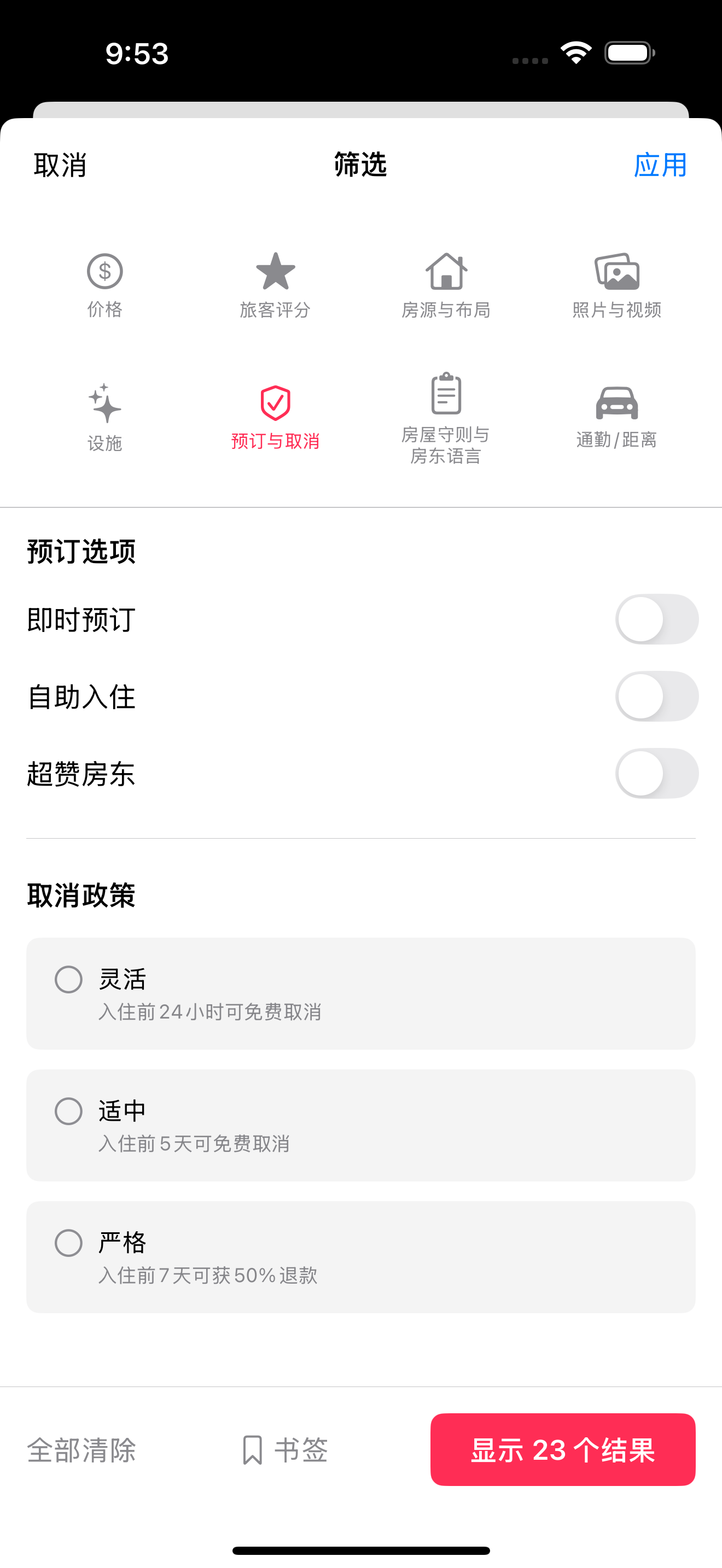 6. 预订和取消: 即时预订、自助入住、取消政策(灵活/中等/严格)