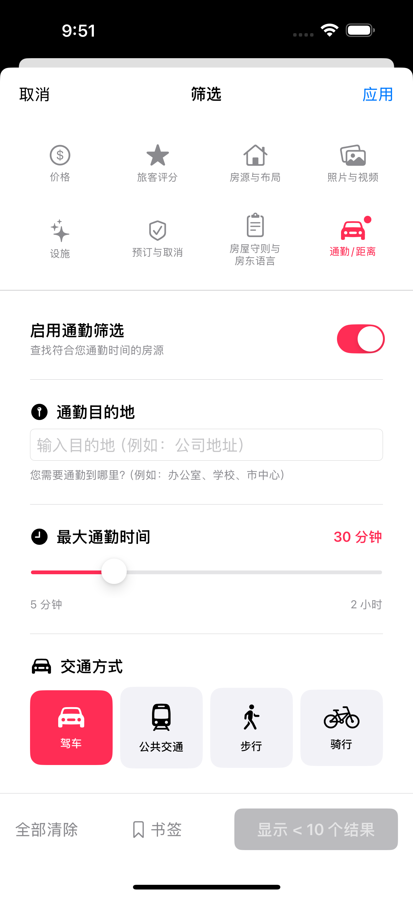8. 通勤/距离: 输入目的地 → 验证 → 选择交通方式 → 设置最长时间(5-120分钟)