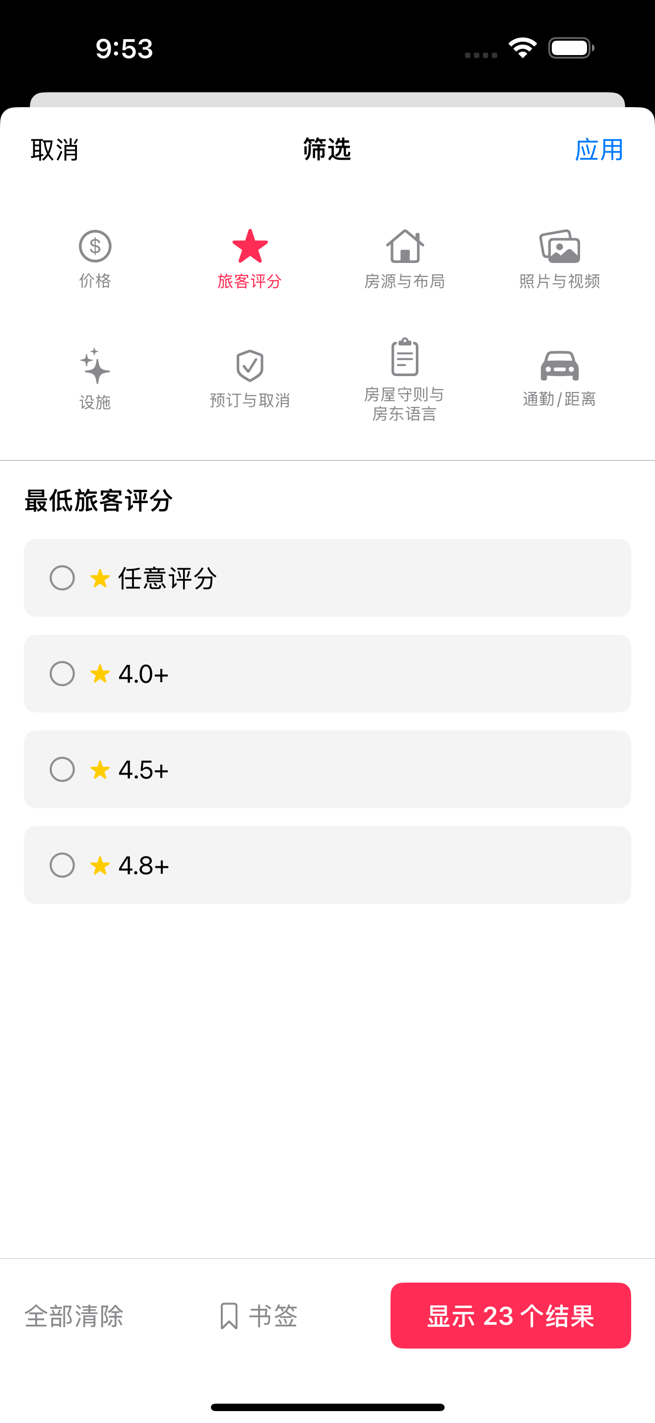 2. 房客评分: 最低评分筛选(任意、4.0+、4.5+、4.8+、5.0)
