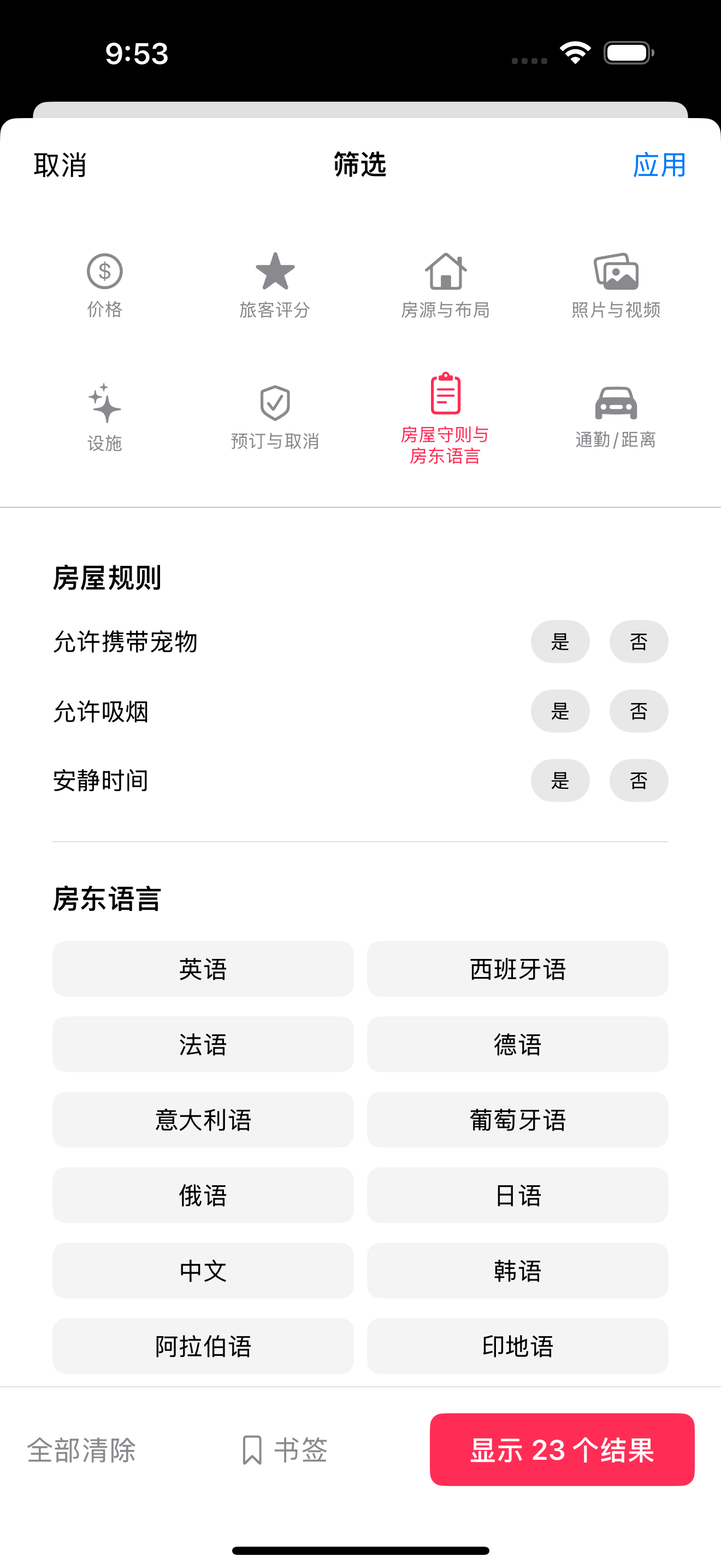 7. 房屋规则和房东语言: 三态筛选(宠物/吸烟/活动),房东语言多选