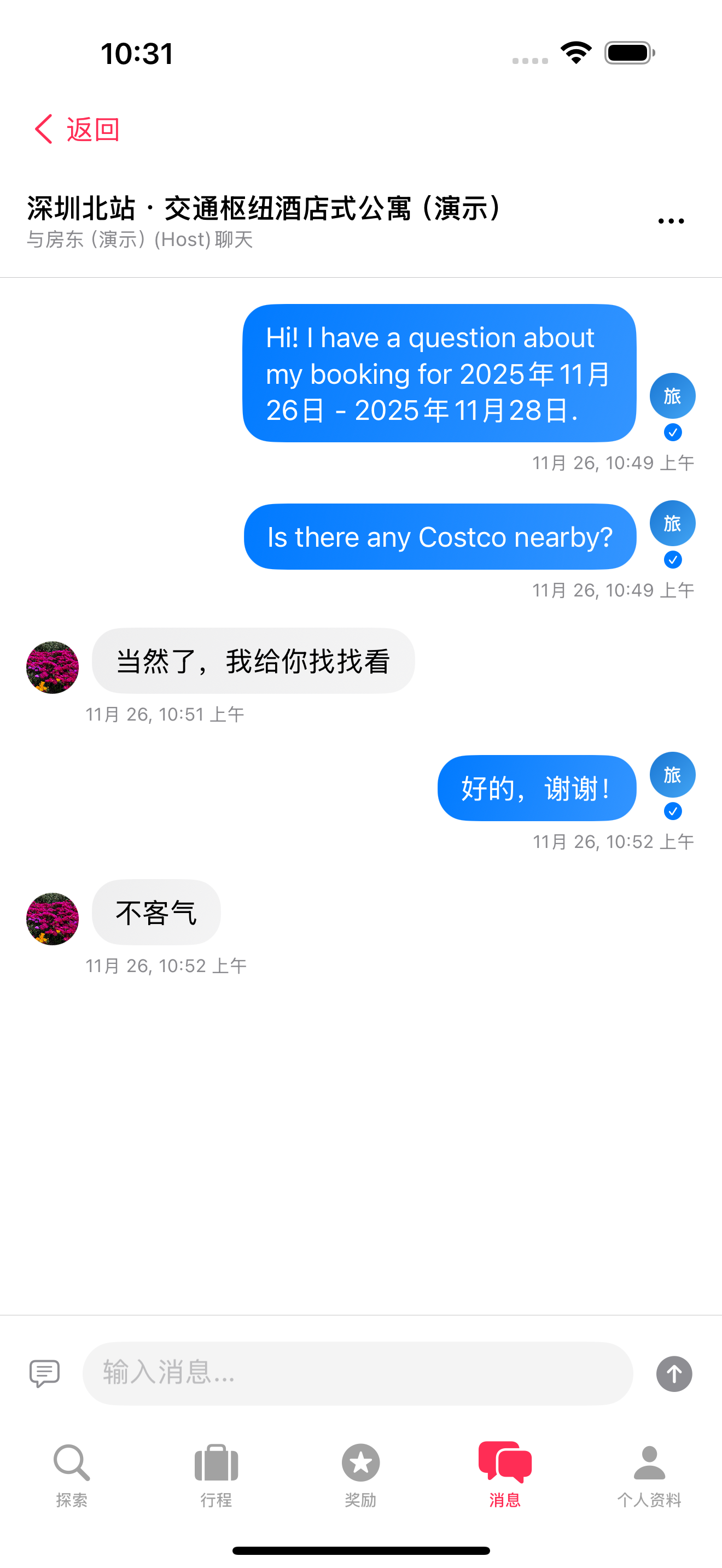 - 消息气泡: 蓝色为您发送,灰色为房东发送