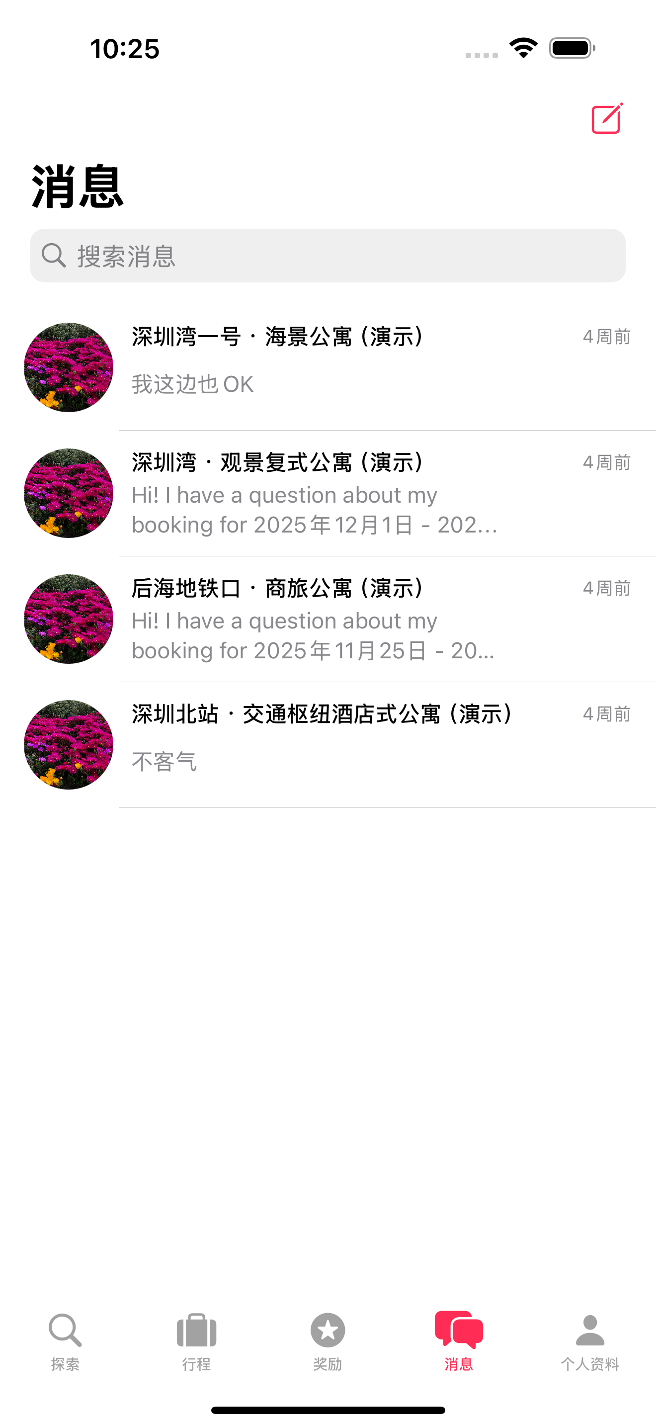 收件箱显示所有与房东的对话,红色徽章表示未读消息数量。