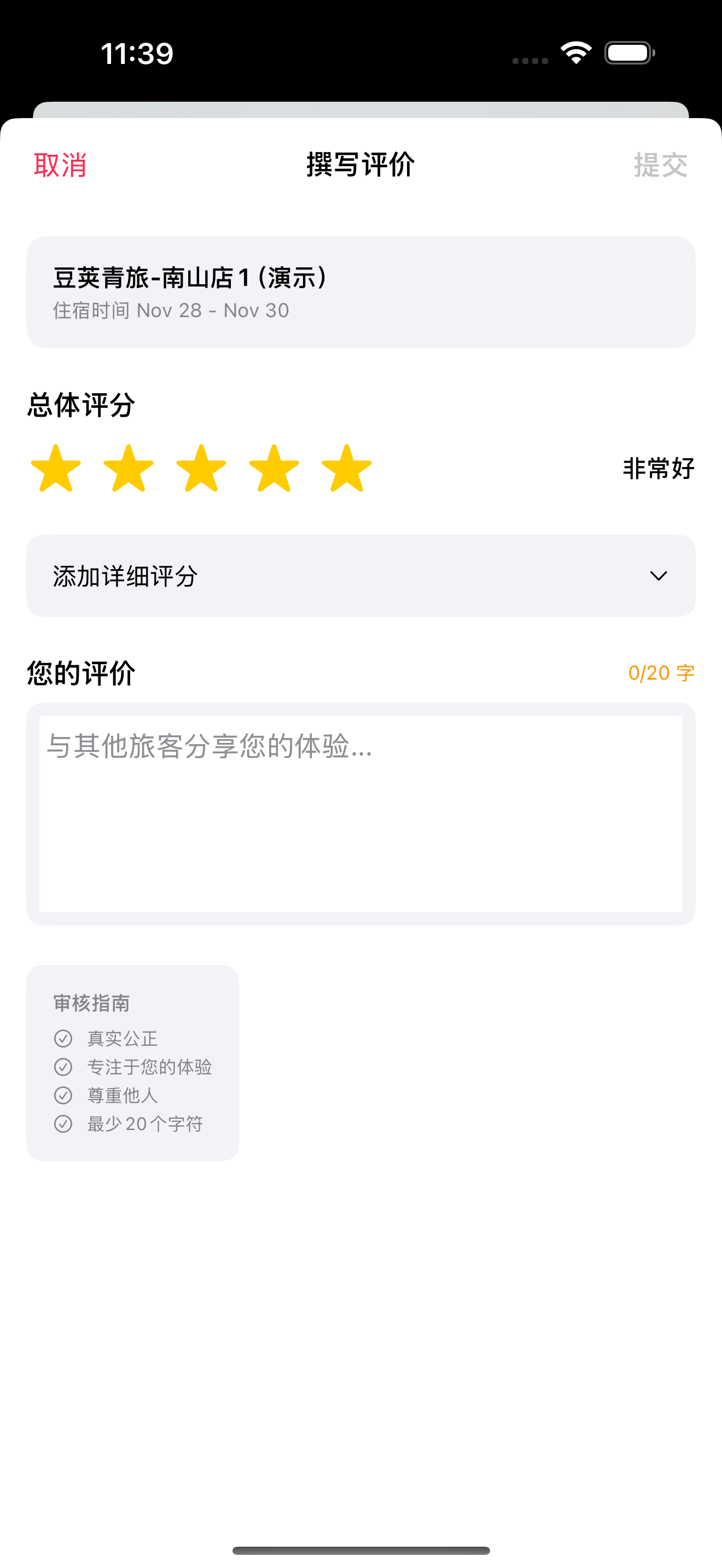 提交后: 私密直到双方都评价,发布后无法编辑,房东可回复