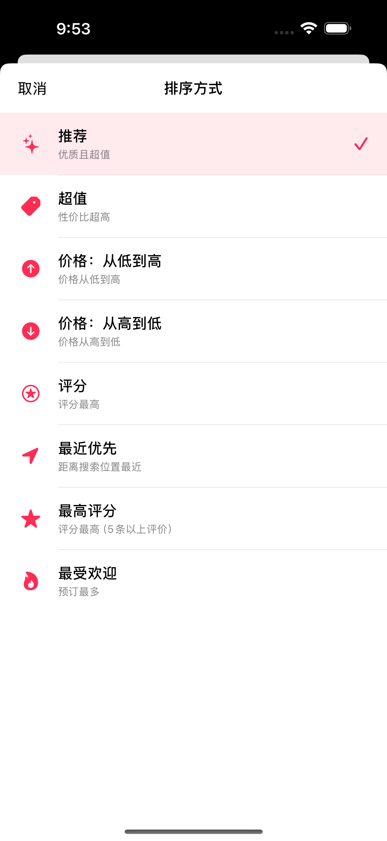 排序选项(8种): 推荐(默认)、最佳性价比、价格从低到高、价格从高到低、评分、距离最近、好评最多(5+评价)、最受欢迎
