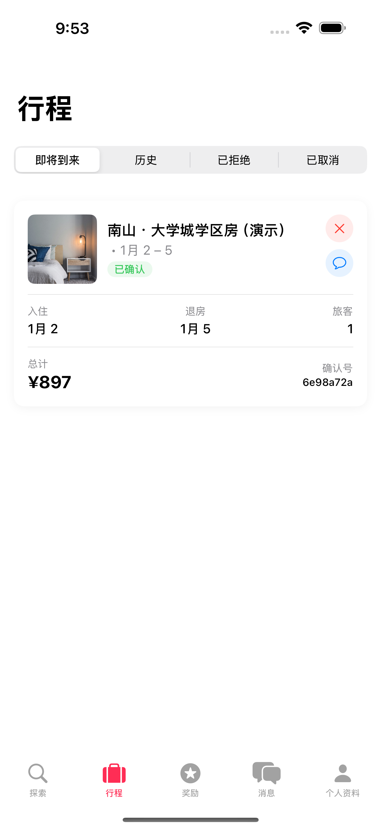确认后收到: 应用内消息、预订参考编号、邮件确认、与房东的消息线程