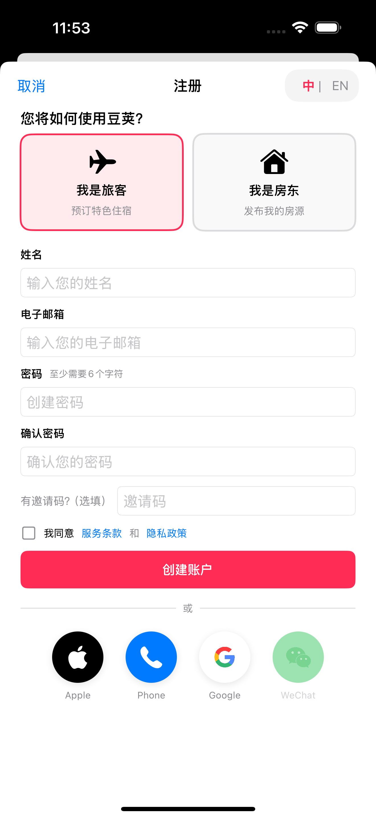 邮箱注册步骤: 1. 点击”注册” 2. 选择角色:房客或房东 3. 输入邮箱和密码(至少6个字符) 4. 同意服务条款 5. 点击”创建账户” 6. 验证邮箱(查收收件箱) 7. 完成首次设置