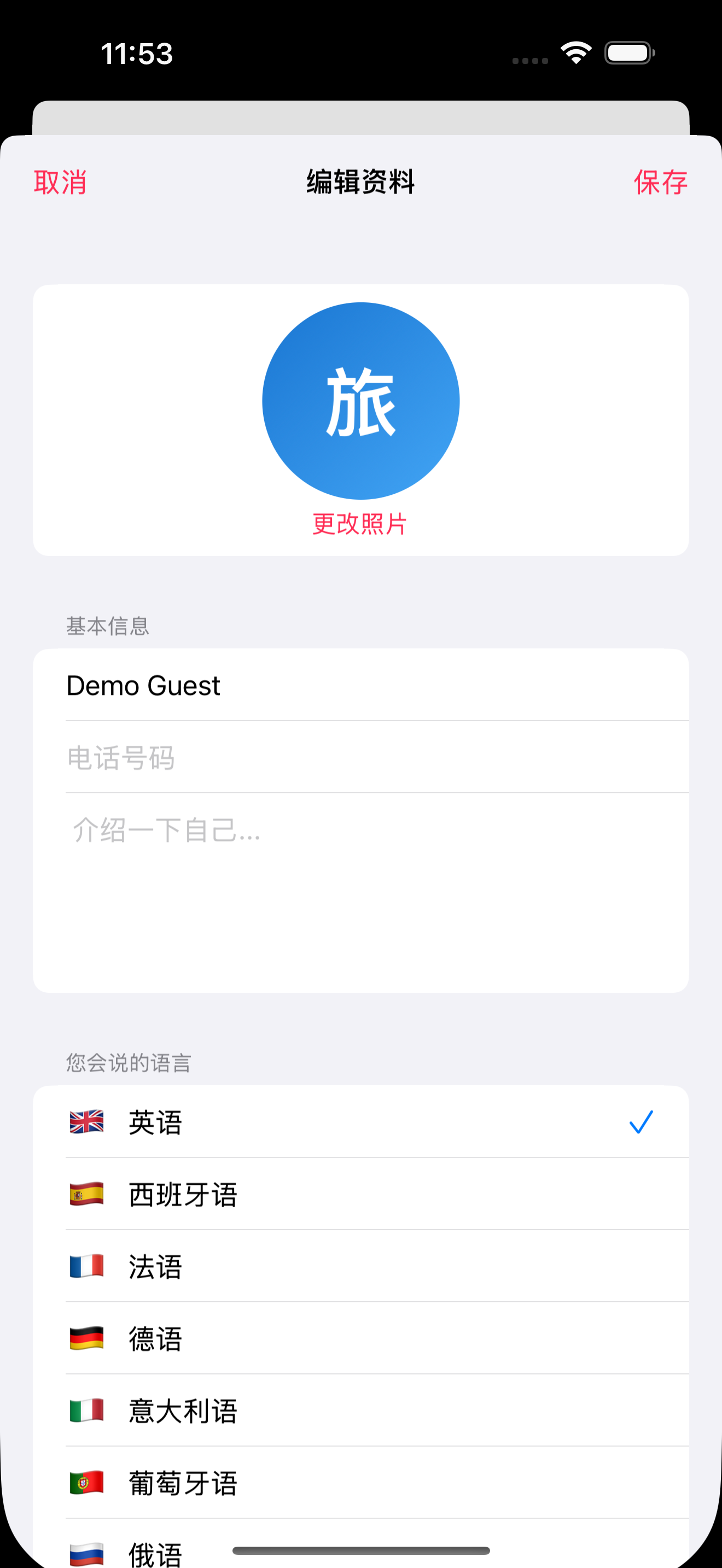 - 编辑个人资料中的语言添加国旗图标