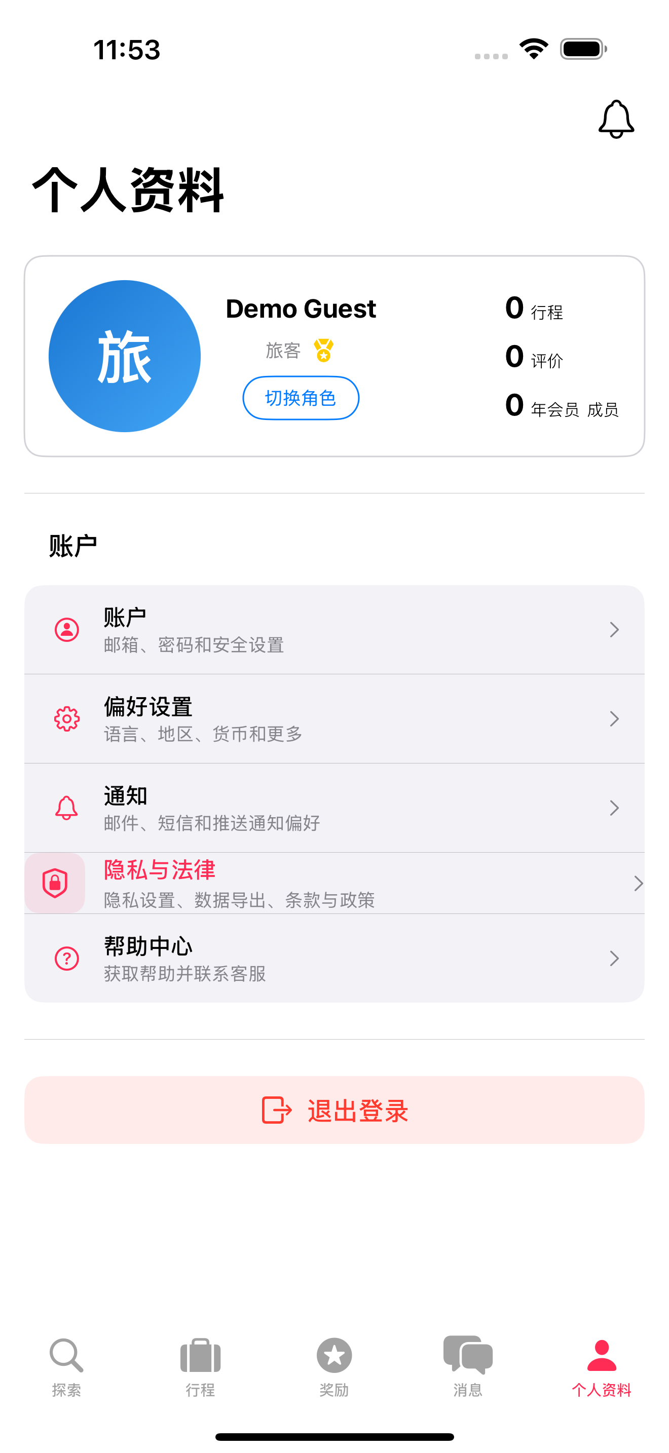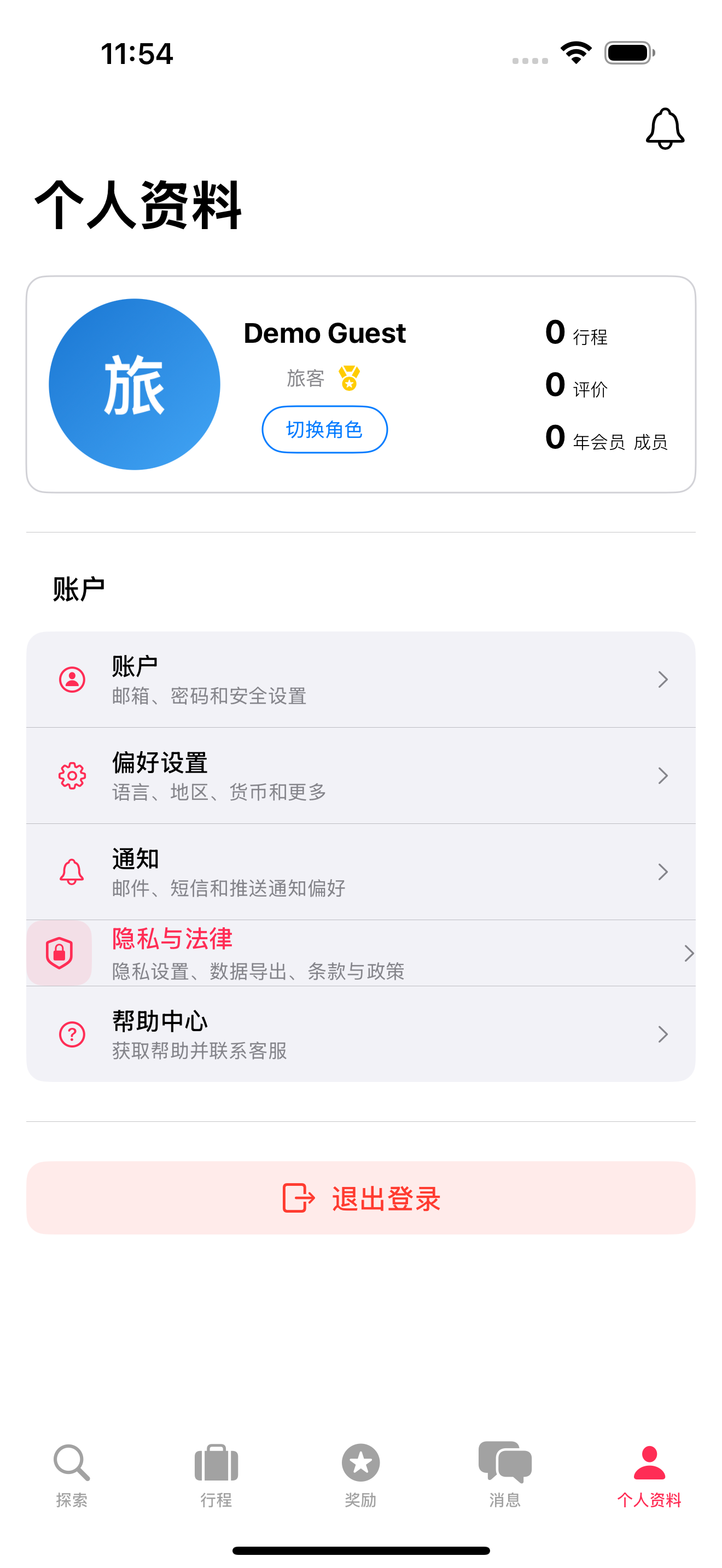 退出当前设备: 1. 点击个人资料标签(人像图标) 2. 滚动到底部 3. 点击退出登录(红色按钮) 4. 确认 5. 跳转至登录页面
